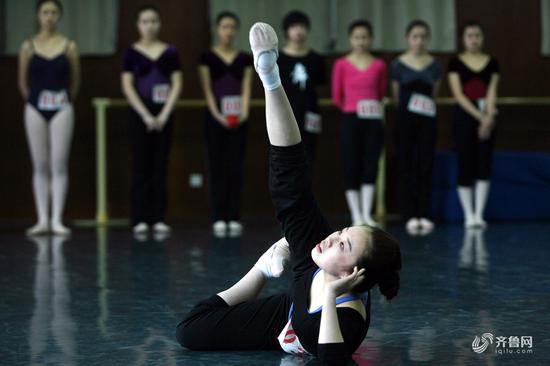 2009年2月10日,山东艺术学院舞蹈学院2009年艺考开始,在舞蹈表演专业考试现场,考生熟练的做着各种高难度技巧动作。图片来源:视觉中国