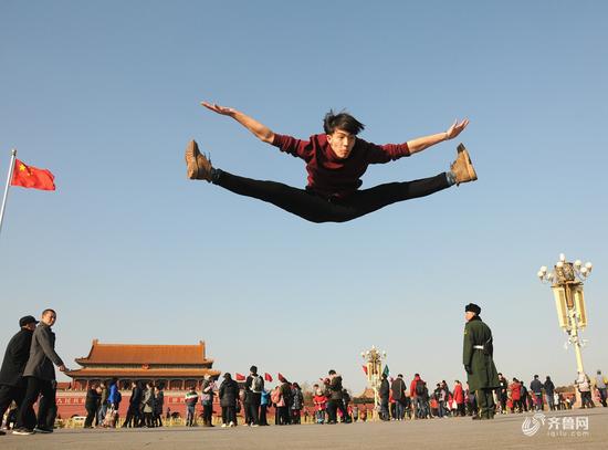 2017年02月23日,北京天安门广场,一位准备参加某舞蹈学院艺考的男生腾空起舞。