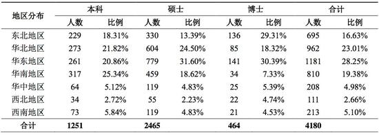 按照地区分布情况统计,2017 届签约就业的毕业生主要分布在华东、华北、华南和东北地区,共计 3648 人,占签约就业毕业总数的 87.27%。