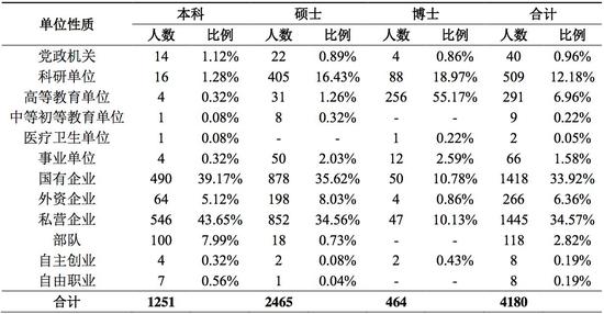 2017 届本科毕业生 3974 人,其中国内升学 1995 人、出国(境)留学 548 人、签约就业1251 人;硕士毕业生 3047 人,其中国内升学 404 人、出国(境)留学为 117 人、签约就业 2465人;博士毕业生 538 人,其中国内升学 42人、出国(境)留学 25 人、签约就业 464 人。