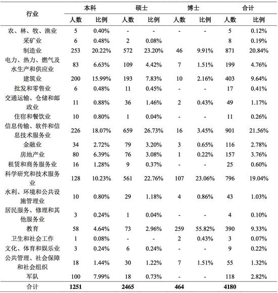 按就业单位所属行业统计,2017 届签约就业毕业生主要分布在信息传输、 软件和信息技术服务业(901 人)、制造业(871 人)、科学研究和技术服务业 (796 人)、建筑业(403 人)、教育(390 人),共计 3361 人,占签约就业毕业生总数的 80.41%。