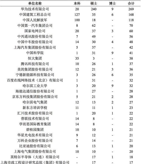 2017 届毕业生到重点单位就业人数超过 40 人的有 8 家,分别为华为技术有 限公司(269 人)、中国建筑工程总公司(168 人)、中国第一汽车集团公司(70人)、国家电网公司(60 人)、中兴通讯股份有限公司(56 人)、中国中车股 份有限公司(48 人)、上海汽车集团股份有限公司(42 人)、中国科学院(41人)。