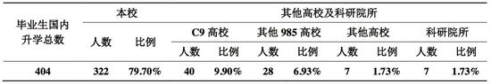 2017 届硕士毕业生中国内升学共有 404 人,占硕士毕业生总数 13.26%,其中 322 人到本 校、40 人到其他“C9”高校、28 人到其他“985 工程”高校、7 人到其他高校、7 人到科研院所。 如表 3-7 所示。