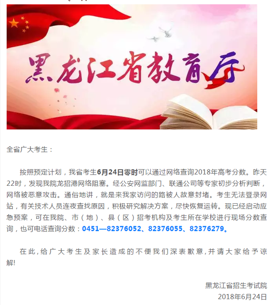 按照预定计划,我省考生6月24日零时可以通过网络查询2018年高考分数。昨天22时,发现我院龙招港网络阻塞。经公安网监部门、联通公司等专家初步分析判断,网络被恶意攻击。通俗地讲,就是来我家访问的路被人故意封堵。考生无法登录网站,有关技术人员连夜查找原因,积极研究解决方案,尽快恢复运转。现已经启动应急预案,可在我院、市(地)、县(区)招考机构及考生所在学校进行现场分数查询,也可电话查询分数:0451—82376052、82376055、82376279。