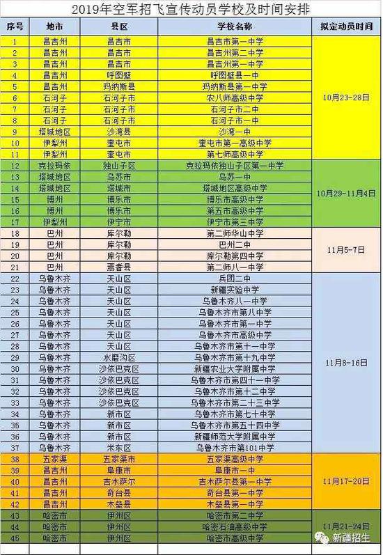 2019年空军在新疆招飞宣传动员工作将于2018年11月底结束,空军招飞宣传动员小组将对新疆45所高中入校进行“面对面”宣传动员,同时组织现场报名工作。希望广大热爱飞行,愿意投身我国国防事业的应、往届高中毕业生积极报名。各地州具体宣传动员时间,由空军招飞动员小组与当地招办及学校商定后通知。由于新疆地域广阔,招飞动员小组工作时间有限,未设面对面动员学校的地州、市(县),可由当地招办组织学校按照标准条件推荐报名。