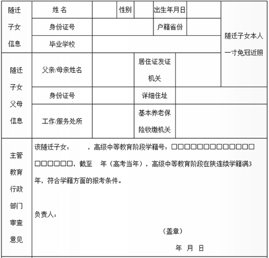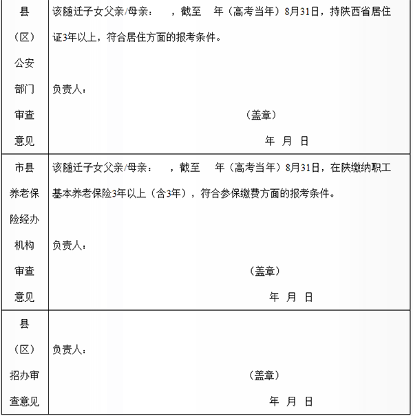 (三)资格审查。拟在陕报名参加高考的随迁子女,要在高考报名前,到学籍所在县(区)招办提出申请并领取《进城务工人员随迁子女在陕参加高考报名申请表》(表样见附件),然后在各地规定的时间内分别前往本人学籍所在主管教育行政部门、父亲或母亲或法定监护人居住登记地县(区)公安部门及参加缴纳城镇企业职工基本养老保险的市养老保险经办处或县(区)养老保险经办中心办理报名资格审查手续。