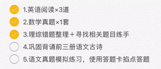 在时间管理方面,首先要做每天的日程计划——可以以时间轴或事项清单的形式列出来,完成一项勾选一项,这样除了有条理外,还能令人产生成就感。尤其在高考倒计时阶段,所有课程都进入了复习模式,这种知识巩固的成就感更来之不易。