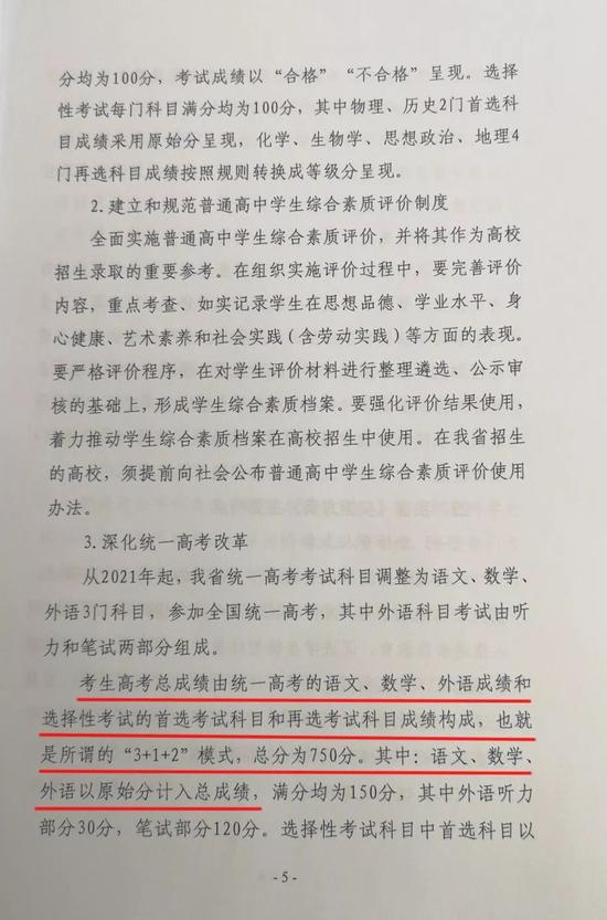 考生高考总成绩由统一高考的语文、数学、外语成绩和选择性考试的首选考试科目和再选考试科目成绩构成,也就是所谓的“3+1+2”模式,总分为750分。其中:语文、数学、外语以原始分计入总成绩,满分均为150分,其中外语听力部分30分,笔试部分120分。