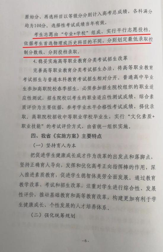 考生志愿由“专业+学校”组成,实行平行志愿投档,依据考生首选物理或历史科目的不同,分别划定最低录取控制分数线,分别投档录取。