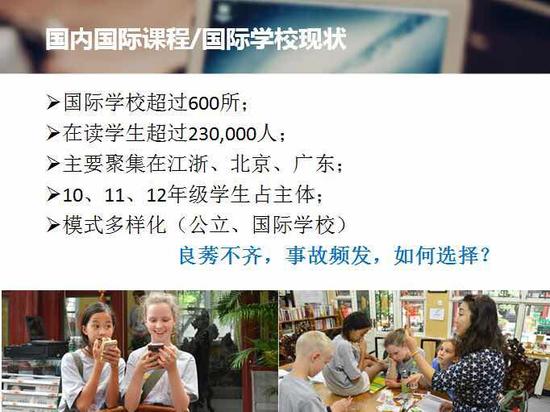 目前在中国大陆地区的国际课程和国际学校现状,国际课程、国际学校比较难界定,分为公立学校的国际班和独立的国际学校,但从整个情况来看,国际学校,规模超过将近600所,在读的学生目前有超过23万人,目前从集中区域来看,主要在江浙一带,北京、广东为主体。我接触很多华东地区的学生,初三结束才考虑进入国际学校,基本上十年级、十一年级、十二年级占主体,市面上国际学校现在基本上十年级采取IG、CICE的课程,十一年级、十二年级才学IB或A-level。从目前的情况来看,在华东地区,尤其是上海、南京、杭州的学生,整体水平在中国是较优秀的一批,同时华东地区的学生往往都是奔着出国,北京地区,许多最优秀的学生还是冲着清华、北大去的。
