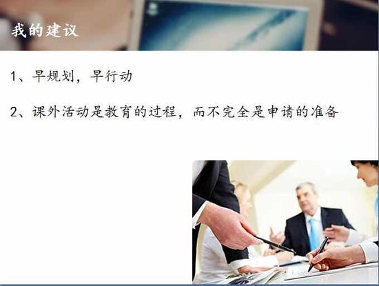在很多家长咨询过程中,会问到说美国的申请到底需要哪些,其实你最多可填写十个课外活动,而且要求详细地填,比如每周花多少时间,让你描述一下课外活动是什么。美国很多学校文书里边都有一道题说请描述一下你觉得最光荣的一个课外活动。那会有家长问是不是课外活动越多越好?我们会认为课外活动,你假设有十项课外活动,我们认为需要至少有两项你比较持久,比较深入,最好能够有一定的成果,课外活动深度比数量更重要。如果你活动太多,会影响你的标化成绩,影响平时的GPA,甚至会影响你的申请。所以活动组织过程,不是越多越好,更多的可能看深度和持续,我们会建议有两个比较持久的活动,基于活动来提升你的影响力,这样会更好。