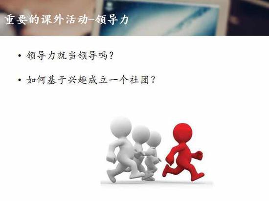兴趣和热情所在,课外活动会更加有效,我会经常问学生,你在音乐、体育方面有哪些兴趣?在社团方面有哪些兴趣,我们有个学生对小说对福尔摩斯或者推理小说特别感兴趣,他进行了大量的阅读,那这是切入点就找准了,可以根据他的兴趣爱好组织推理小说的社团,根据推理小说的社团来招募成员,做微信号推广,提升他的影响力,甚至做一些小的视频,把福尔摩斯推理的方法引入到这个学校。