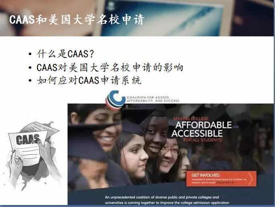 CAAS,目前美国推出了一个新的申请系统,学生从九年级开始就可通过申请系统来提交材料,本身这个申请系统目前还没有完全地运转,但完全运转之后,对各位同学和家长来讲,你课外活动的规划就应该从九年级开始,因为从九年级开始,就可以将课外活动的一些东西提交到申请系统里去,学校在录取的时候,直接可以看到九年级以来所有的课外活动和所有表现。