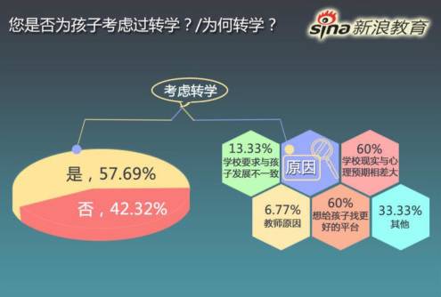 上半年,新浪教育曾做过一次关于“国际学校家长对转学有何看法”的调查,在接受调查的已经完成择校行为的3072个家长中,57.69%的家长考虑过给孩子转学。择校已经不再是“一次性”的行为,他们在为孩子选择更好的教育上不断探索。转学的问题多发生在对升学影响不是很大的低年级阶段,常见原因是学生发展与学校情况不对等,要么学校与心理预期不一致,要么想给孩子找更好的平台。