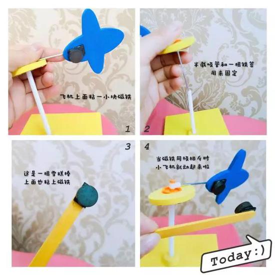 千寻在思考飞行动力的问题时,发现我们家现有材料很难搞定电力或者油动力,最后她想到了利用磁铁同极相斥的原理,我觉得非常有创意。重点是,这个idea不是一开始就有的,它是在没有依赖现成模式,自主思考和探索的过程中产生的。
