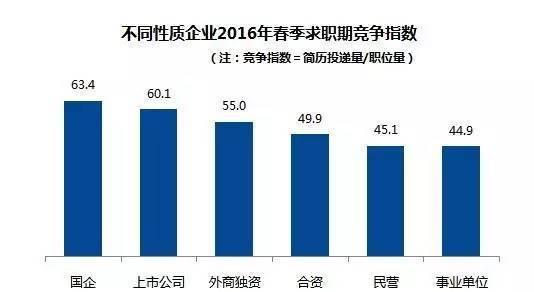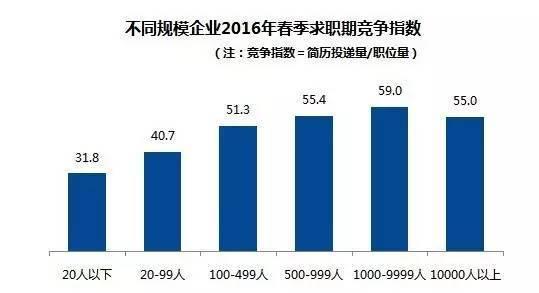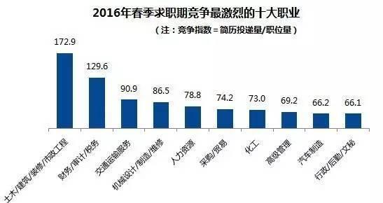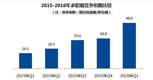 2016年春季,全国人才供需竞争指数(供需竞争指数=收到的简历投递 量/发布的职位数量)为48,意味着从全国范围来看,平均一个职位收到了48份简历。与2015年全年的数据情况对比来看,2016开春竞争指数上升幅度 非常明显,全国的求职市场竞争非常激烈,形势相对2015年底更加严峻。