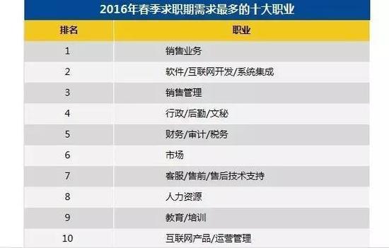 从2016年春季不同职业对人才的需求量来看,销售业务、软件/互联网开发/系统集成、销售管理三大职业对人才的需求量最大,这三大职业依然保持着2015年对人才需求强烈的势头,排名稳居前三名。