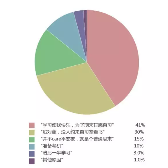 根据调查显示,41%的同学认为“学习使我快乐”是驱使自己在平安夜来到自习室的原因,占了绝大多数。而有30%的同学是因为——没对象,没人约,来自习室看书,非常惨。