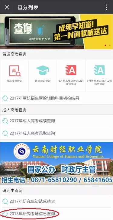 感谢你关注云南省招考频道官方微信公众号(ynzs-cn)!2018年云南省硕士研究生考试考场信息已可查询,你可以通过点击公众号下方菜单栏中的“查询”按钮进入到分数查询列表,找到“2018年研究生考场信息查询”按钮点击后输入“准考证号+证件号+验证码(点击图片刷新)”,即可查到本次考试考场信息。