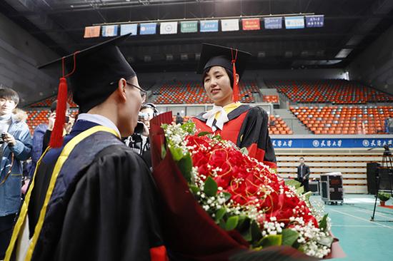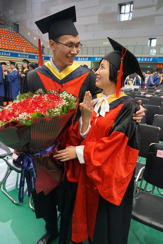 “亲爱的,请嫁给我吧?”手捧鲜花,单膝跪下,掏出准备好的戒指,欧阳群安向相伴五年的同门同学齐春风求婚,现场近3000名同届毕业的同学则见证了这一浪漫时刻。