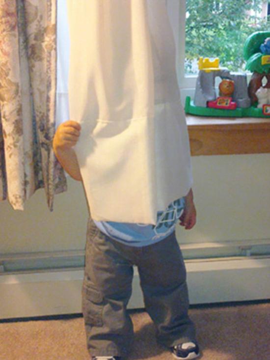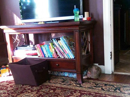 但许多小孩都没有认真考虑藏身之所。有个小孩躲在了厨房橱柜里,但忘了腿伸在外面穿帮了。有个三岁小孩躲在电视柜下,无奈身子太长,脑袋探到了外面。