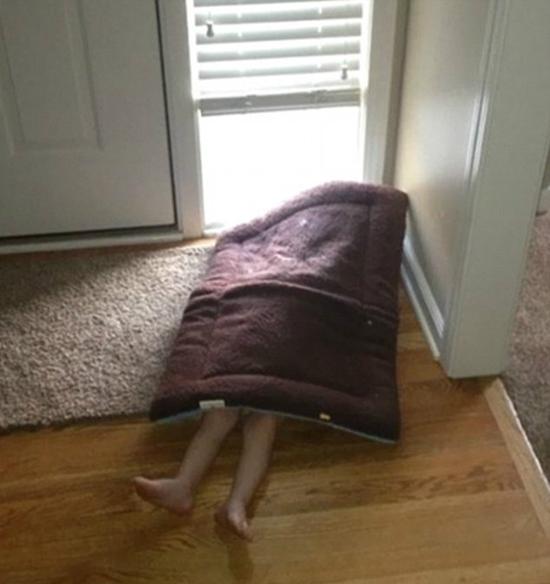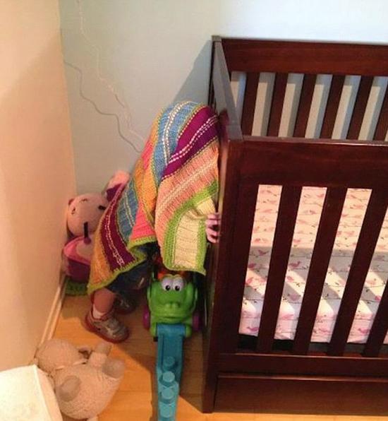 许多小孩躲猫猫的创意之举都贴在了Reddit上,有的脑袋胳膊露出来,还有的因为腿脚从物品背后戳出来暴露了。