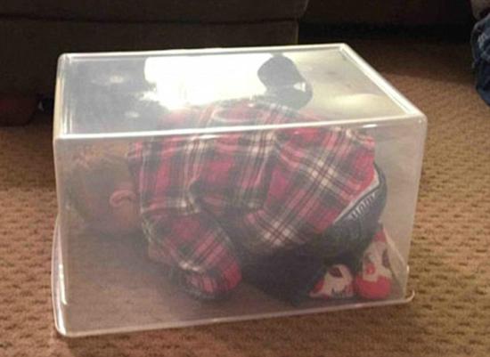 有的小孩试图躲在透明箱子里,还有的借助杆子甚至是玩具鳄鱼的帮助试图藏身。一个年幼的小女孩成功把自己卡到马桶后的缝隙里,其父母对此印象颇深,在Imgur上写道:“我女儿也要成为躲猫猫专家了。”