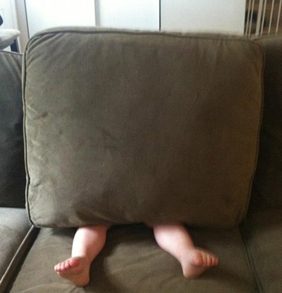 有个蹒跚学步的小孩举起枕头盖在脸上,还有用玩具鳄鱼的和试图躲进沙发里的。