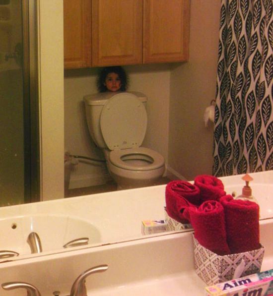 While some tried to use a transparent box, others used a pole or even toy crocodile in an attempt to hide themselves。 One young girl managed to squeeze behind the toilet and impressed her parents who posted it to Imgur with the caption: ‘My daughter is also going pro at hide and seek。’