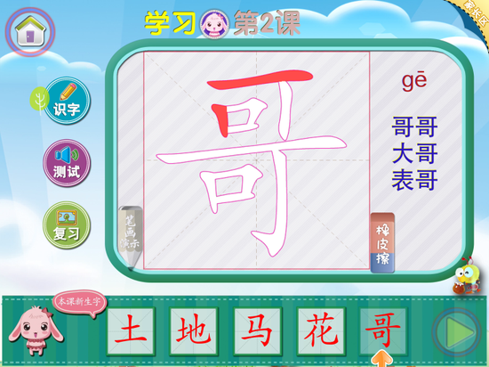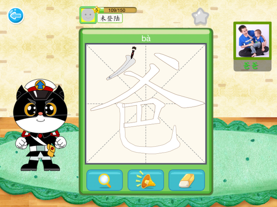 悟空识字:利用儿童熟悉的西游故事,孙悟空、猪八戒等可爱的人物造型,通过形学,让孩子记住汉字。结合《西游记》经典场景,寓教于乐,让儿童在游戏中快乐地认识汉字。动画视频内容丰富,儿童可参照给出的卡片进行跟写、跟读,还可自己录制故事书,并能够为儿童记录对各个汉字的熟练程度。