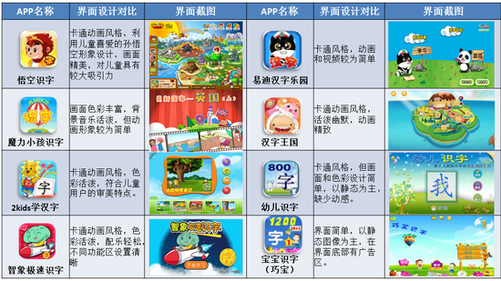 儿童识字类APP主要针对的是2-8岁儿童,因此在产品设计上多数APP采用了学习和娱乐相结合的形式, 通过图片联想、场景重现、游戏过关、故事儿歌等形式,将汉字发音练、笔画书写等贯穿其中,帮助儿童完成汉字的学习与记忆。但识字类APP主要目的是汉字的学习,尤其是针对低龄的儿童用户,如何通过完整的线索和合理的设计来引导儿童完成学习任务,而不仅仅是通过绚丽的动画色彩来吸引眼球是判断一款识字APP好坏的重要因素。比如汉字王国,虽然画面相当精美,符合低龄儿童用户的特点,但在汉字的认知环节,相比其他几款产品则略显不足,“脑力操”的游戏的形式略显复杂,且没有与识字相结合。