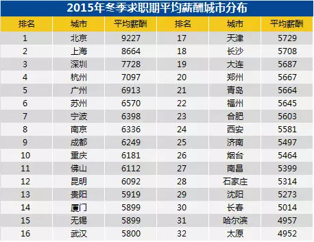 《2015年冬季中国雇主需求与白领人才供给报告》求职寒冬里的白领平均月薪吓到你了吗?杭州全国第四