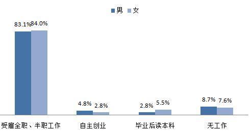 14.3%的2014届本科女生在国内外读研(微博),高于同届本科男生(12.5%)1.8个百分点。2014届高职高专女生毕业后读本科的比例(5.5%)比高职高专男生(2.8%)高2.7个百分点。