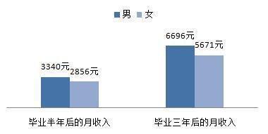 麦可思数据显示,2014届毕业的本科女生半年后的月收入(3505元)比本科男生(4012元)低507元;2014届毕业的高职高专女生半年后月收入(2866元)比高职高专男生(3518元)低652元。