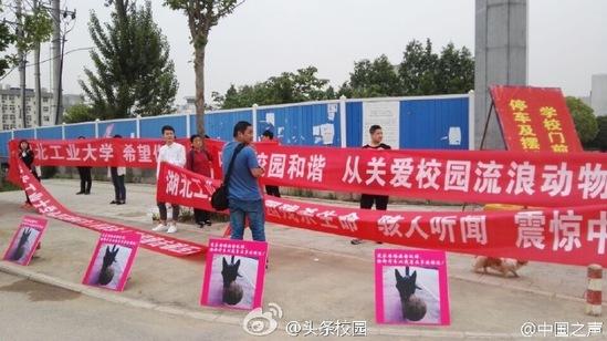 爱狗人士校门口示威湖北工业大学保安撞狗护学生事件发生后,今天大量“爱狗人士”集结至该校门口,堵住进校主路拉横幅为被撞狗讨要说法。据网友爆料的视频,现场疑有多人发生肢体冲突,并且已经对交通造成了阻碍。你们怎么看?