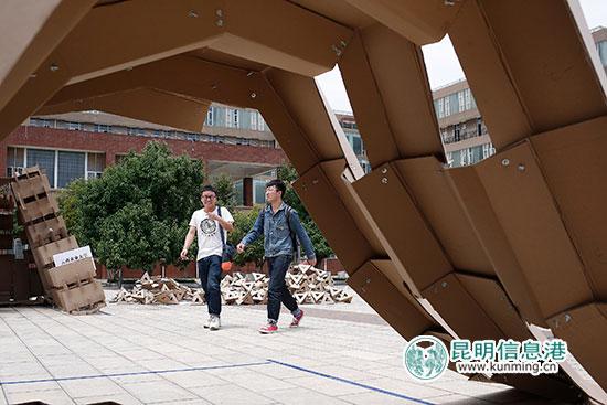 昨天上午,昆明理工大学建筑与城市规划学院广场,23个风格迥异的纸板建筑矗立在学院广场上,给人一种视觉上的冲击。不少同学和老师经过时,不免会被广场上堆放的纸板建筑吸引,纷纷拍照。