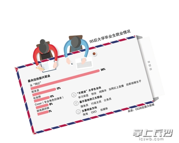根据《QQ浏览器大数据:谁都无法代表95后》中的数据显示,服务员、行政文员、公务员成为95后最不喜欢的三大职业。在这些小鲜肉看来,公务 员、国企员工等所谓的“铁饭碗”是父母一辈的选择,对自己来说,不太在乎岗位身份的“象征意义”,更多人愿意从事自己感兴趣的一门职业。而作为跟随互联网 发展而成长起来的一代人,95后非常敢于尝试由互联网所催生的各种新鲜职业。在如今人人都能当主播的年代,95后都盼着能够拿起手机当“网红”。报告显 示,在95后最向往的新兴职业排行榜上,54%的受访者渴望当“网红”,排在其后的是配音员、化妆师、Coser(专业角色扮演者)、游戏测评师等职业。