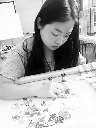 胡珺在制作汉绣包包。记者李芳 通讯员郎丽华