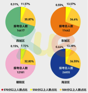 上面两张图是2016年北京四个城区的中考成绩对比图,抛开报考人数的较大差距,东西海朝四城区500分以上人数占比均为35%左右,朝阳区略低,550分以上几乎都为13%左右,四城区中考成绩并无根本差距。