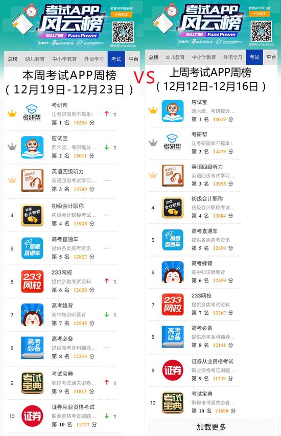 根据往年考生经验,最好平静的看一下师哥师姐以及老师们总结的那些必考点,把每一个知识点再串联一下,不熟的点单独拎出来背诵一遍。实在找不到方法的小伙伴,可以下载几款软件,例如:考研帮、考研派、研途宝考研等,这些APP都是考研宝宝的小天地,能够迅速的获取最新消息方便大家相互交流。想静心做题的小伙伴可以选择口袋库考研、粉笔考研、考研万题库等APP,方便大家在线浏览各科目的试题以及历年真题,能够更加便捷的查漏补缺。当然选择背单词、背政治提纲、看下最近时事热点等都是可以的。不过心态不好的小伙伴,还是早点休息别费脑子,不然很容易给自己造成心理压力,影响第二天的考试。失眠的盆友,真的没有更好的办法,或许可以听一些容易催眠的音乐让心情舒畅一些。据说考前一天不要外出运动比较好,容易受伤也会消耗能量~同时也为大家献上本周“教育APP风云榜”的周榜榜单,大家可以查看考试类榜单,获取更多相关APP的信息,各取所需。