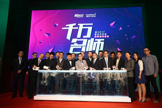 1月18日,2017新东方在线“千万名师”计划签约典礼在北京举行。新东方在线宣布正式启动“千万名师”计划,并公布首批入驻“千万名师”计划的老师名单。新东方教育科技集团副总裁兼教学与知识管理中心主任施柯,新东方教育科技集团副总裁、新东方在线CEO孙畅,新东方在线COO潘欣,新东方教育科技集团国内大学项目事业部总经理兼北京新东方学校国内考试部总监周雷,新东方教育科技集团国内大学项目事业部副总经理兼新东方在线国内考试项目部总监甘源, 新东方在线酷学网项目总监张枫及签约名师代表出席了此次典礼。