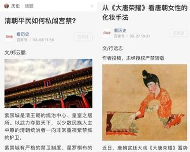 类别是指文章内容在这一垂类的涉猎范围。举个例子,比如《看历史》以历史这一大的垂类为切入点,文章的内容可以通过历史归类到“军事,政治,艺术,教育”等方面。近期《看历史》在百家号上推过《从大唐荣耀看唐朝女性的化妆手法》、《清朝平民如何私闯禁宫》、《唐宋士大夫如何带高帽》等文章,想通过丰富的类别吸引读,给读者带来“刷你的文章,从来不会没意思”的feel。小编通过分析多个百家号加上自己的摸索总结出了一条规律,“在垂类上做的专业且独到,在内容上做的全面且丰富”就能被百家号精准的分发推送到有该类阅读兴趣的读者那里去。有了这个秘诀,这场内容战争你还怕输吗?