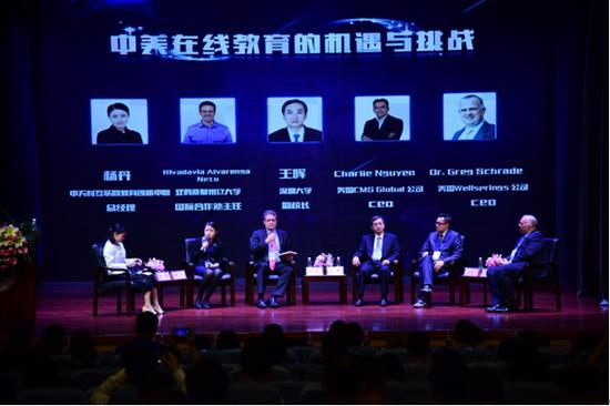 圆桌论坛环节议题“中美在线教育的机遇与挑战”,深圳大学副校长王晖、中关村互联网教育创新中心总经理杨丹、亚利桑那州立大学国际合作处主任 Rivadavia Alvarenga Neto、美国CMSGlobal公司CEO Charlie Nguyen、美国Wellsprings 公司 CEO Greg Schrade 参加与讨论。