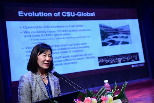 美国科罗拉多州立大学校长Becky Takeda-Tinker博士介绍了目前美国在线高等教育的发展趋势和研究成果,分享了科罗拉多州立大学关于在线教育的线下服务、信息系统建设、学生完课率、学习质量、教学评估等多方面的实践经验。他认为,在线课程的完善和课堂教学的进步是一个互相促进的过程,这种促进对课程质量的提高有非常大的帮助。
