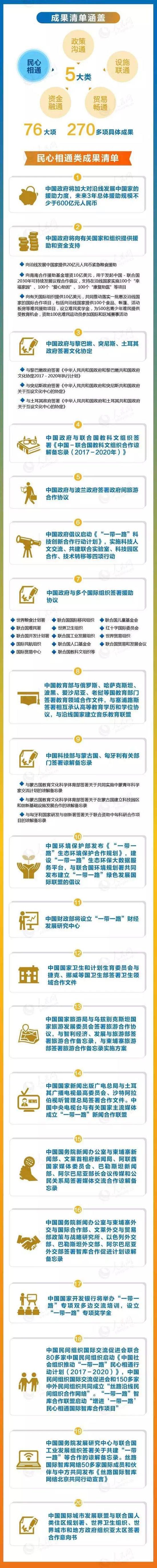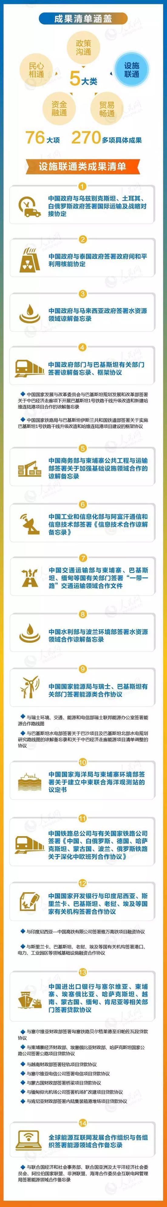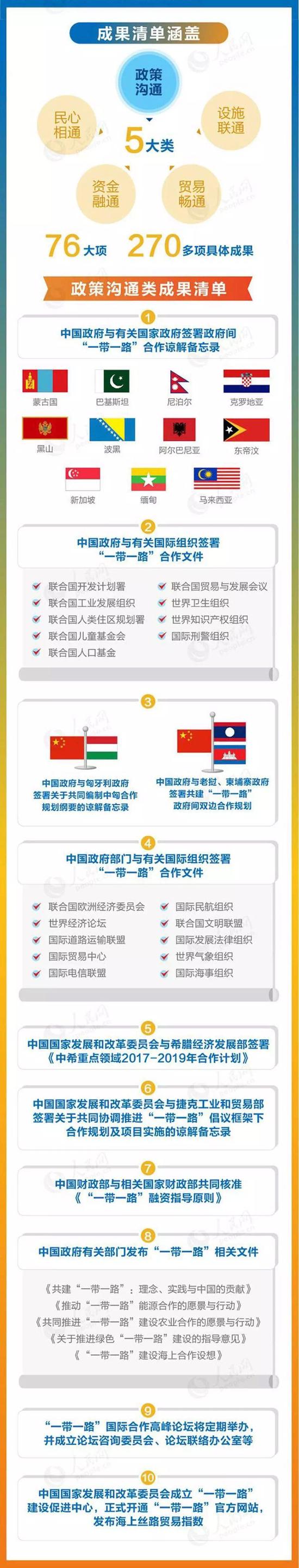 5月15日“一带一路”国际合作高峰论坛圆桌峰会结束后,中方发布了一份“一带一路”国际合作高峰论坛成果清单,这份清单涵盖了政策沟通、设施联通、贸易畅通、资金融通、民心相通5大类,共76大项,270多项具体成果。