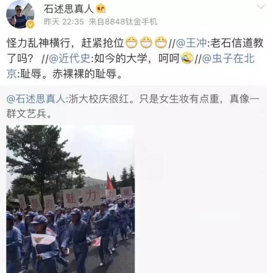 比如中国经济网的评论员石述思就阴阳怪气地写了这么一条微博: