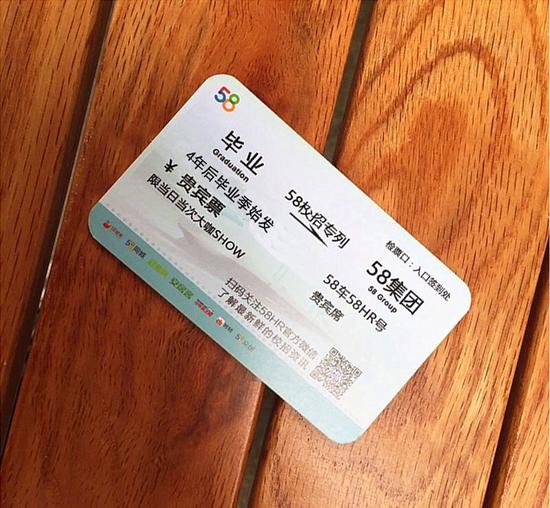 58同城ceo姚劲波则简单明了的设计了一张通往58集团的,校招专列高铁票。寓意4年毕业后可直通58HR招聘。考生们,有图有真相啊,赶紧截图留证,4年之后找工作请艾特@姚劲波哦。