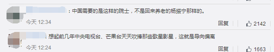 有网友捎带上了别的老先生:中国需要的是这样的院士,不是回来养老的杨振宁那样的。有点小愤青的网友:想起前几年中央电视台、芒果台天天吹捧那些歌星影星,这就是导向偏离。
