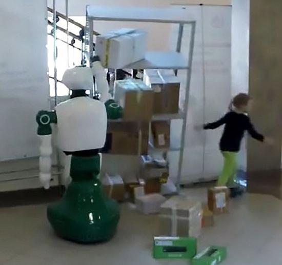 [环球网综合报道]据英国《每日邮报》7月6日报道,近日,俄罗斯某大学制作的一个机器人在关键时刻挺身而出,及时阻止摇摇欲坠的货架倒塌,在危急时刻伸出援手,使得一名小女孩免于被压受伤害。