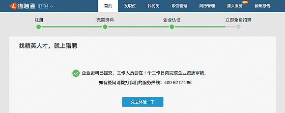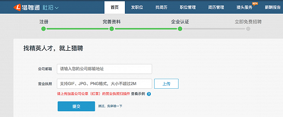在猎聘网上,记者并没有找到任何用户指南或者说明,记者直接以HR的身份注册,发现注册过程是需要提交企业邮箱,以及营业执照,等待审核。
